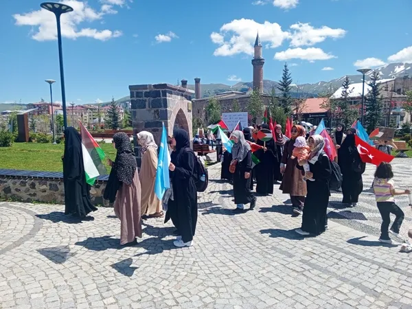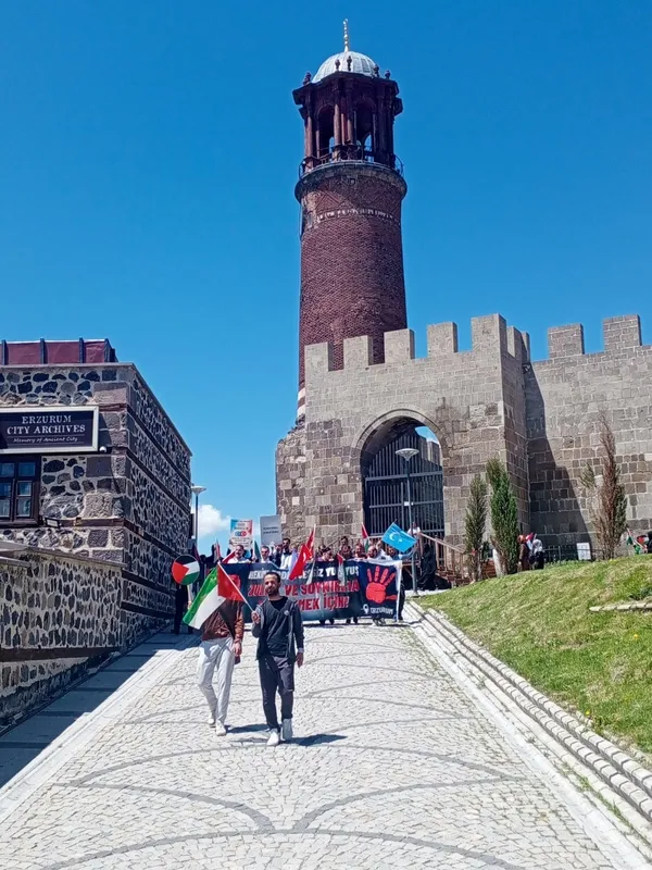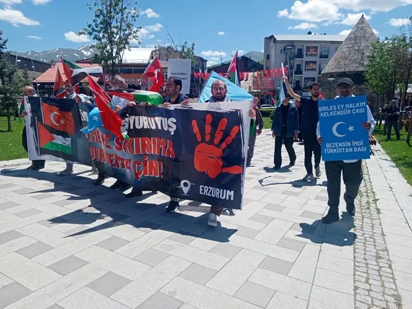 Erzurum Kalesi önünde bir araya gelen aralarında doktor ve tıp fakültesi öğrencilerinin de bulunduğu sağlıkçılar, Türk, Filistin ve Doğu Türkistan bayrakları eşliğinde, taşıdıkları döviz ve pankartlarla kalenin içinde yürüdü.