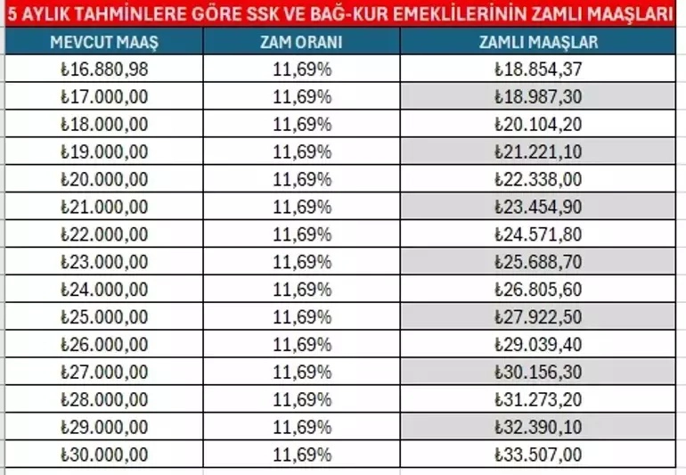 Memur ve emeklilerin ocak ayında alacağı maaş zammını büyük ölçüde belirleyecek olan Kasım ayı enflasyon verileri çarşamba günü açıklanacak. Bu veriyle birlikte 5 aylık enflasyon farkı netleşmiş olacak. Emekli maaş zammı Ocak 2026 enflasyon farkı ile netleşmeye başlıyor. Milyonlarca SSK ve Bağ-Kur emeklisinin gözü, Ocak 2026'da maaşlara yapılacak zam oranına çevrildi. Türkiye İstatistik Kurumu (TÜİK) tarafından açıklanan ilk 3 aylık (Temmuz, Ağustos, Eylül) enflasyon verileriyle birlikte, emekli maaş zammı için ilk kritik ipuçları ortaya çıktı. Son olarak Ekim enflasyon verileri ile maaş zam tablosu yeniden şekillendi. 2025 Ocak yeni yıl maaş zammı ise Ekim, Kasım ve Aralık ayı verilerinin de açıklanmasıyla kesinlik kazanacak. Peki, enflasyon farkına göre emekli maaş zammı ne kadar zam yapılacak? Yeni yıl emekli maaşları ne kadar olacak? İşte SSK, Bağ kur emekli maaşı zammı hesaplama tablosu!
