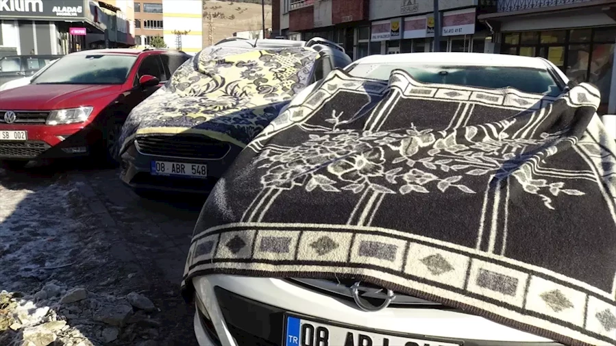 Soğuklar nedeniyle araçların camlarının buz tuttuğu kentte, bazı vatandaşlar buz tutan otomobillerinin camlarını battaniyelerle kapatarak önlem almaya gayret etti.
