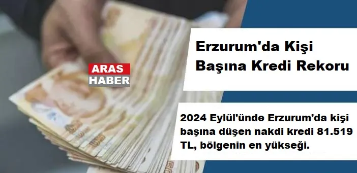 Türkiye Bankalar Birliği TBB 'Nakdi Kredilerin İllere ve Bölgelere Göre Dağılımı' verilerine göre Erzurum'da 2024 Eylül ayı ölçeğinde kişi başına düşen nakdi kredi tutarı kamu banka kredilerinde 54 bin 550 TL, Özel banka kredilerinde 26 bin 968 TL, nakdi kredi toplamında ise 81 bin 519 TL olarak hesaplandı.