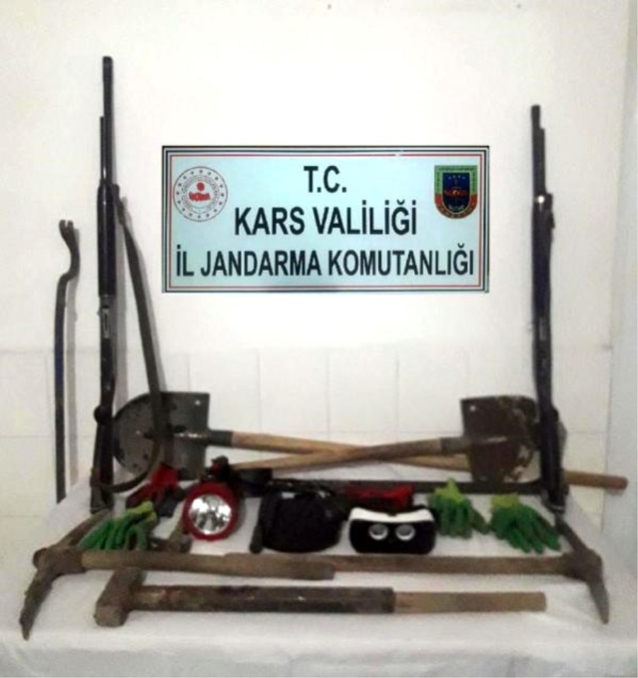 Kars Valiliği kontrolünde, İl Jandarma Komutanlığı'nca Sarıkamış ilçesinin Taşlıgüney köyü Harabedere mevkisinde izinsiz kazı yapan şüpheli 4 kişi, suç aletleri ile birlikte yakalanarak gözaltına alındı. Kazı alanında yapılan aramada 1 adet define arama dedektörü, 1 adet sanal gözlük, 3 adet kürek, 1 adet balyoz, 1 adet manilya demiri, 1 adet murç, 1 adet el freni, 1 adet keser, 2 adet av tüfeği, 5 adet eldiven ve 1 adet plastik kova ele geçirilerek muhafaza altına alındı. Gözaltına alınan şüpheliler hakkında ise adli işlem başlatıldı.