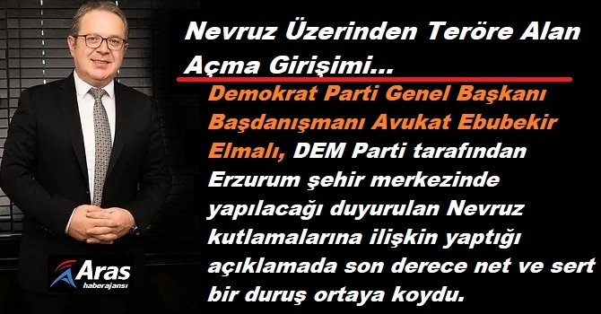 Demokrat Parti Genel Başkanı Başdanışmanı Avukat Ebubekir Elmalı, DEM Parti tarafından Erzurum şehir merkezinde yapılacağı duyurulan Nevruz kutlamalarına ilişkin yaptığı açıklamada son derece net ve sert bir duruş ortaya koydu. Elmalı, yapılan çağrılarda terör örgütü PKK’nın elebaşı Abdullah Öcalan’ın “fiziki özgürlüğü” yönünde slogan ve ifadelerin yer almasının açık bir suç teşkil ettiğini vurguladı.