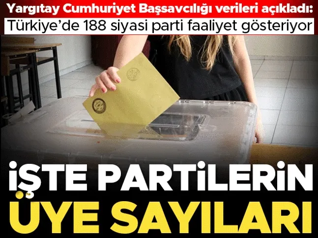 Yargıtay Cumhuriyet Başsavcılığının güncellediği kayıtlara göre, 188 siyasi partinin faaliyette olduğu Türkiye'de, AK Parti 11 milyon 543 bin 301 ile en fazla üyeye sahip siyasi parti konumunda bulunuyor.